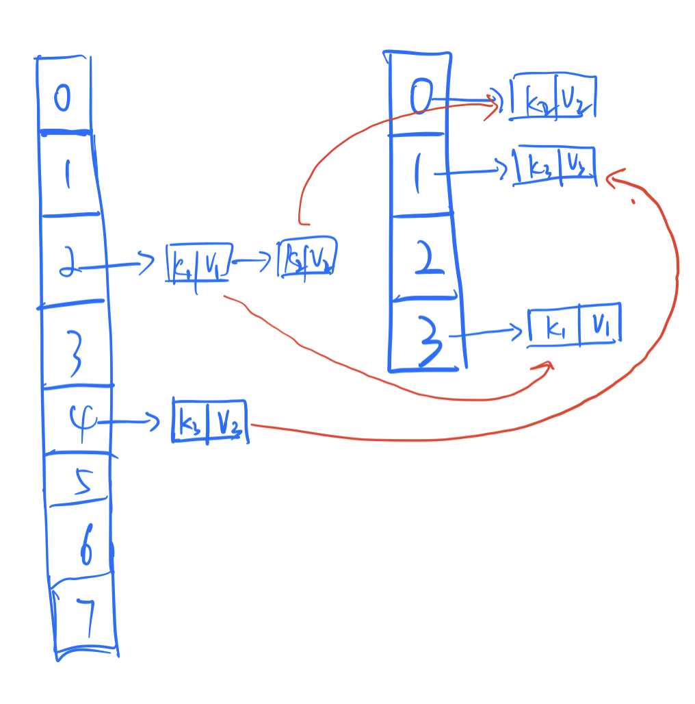 同理当容量不足的时候,字典会进行扩容。容量大小会翻一倍(乘 2)。也是一样生成一个新的。把旧的哈希表(h[0])中的数据重新 hash 放到新的哈希表中(h[1])。