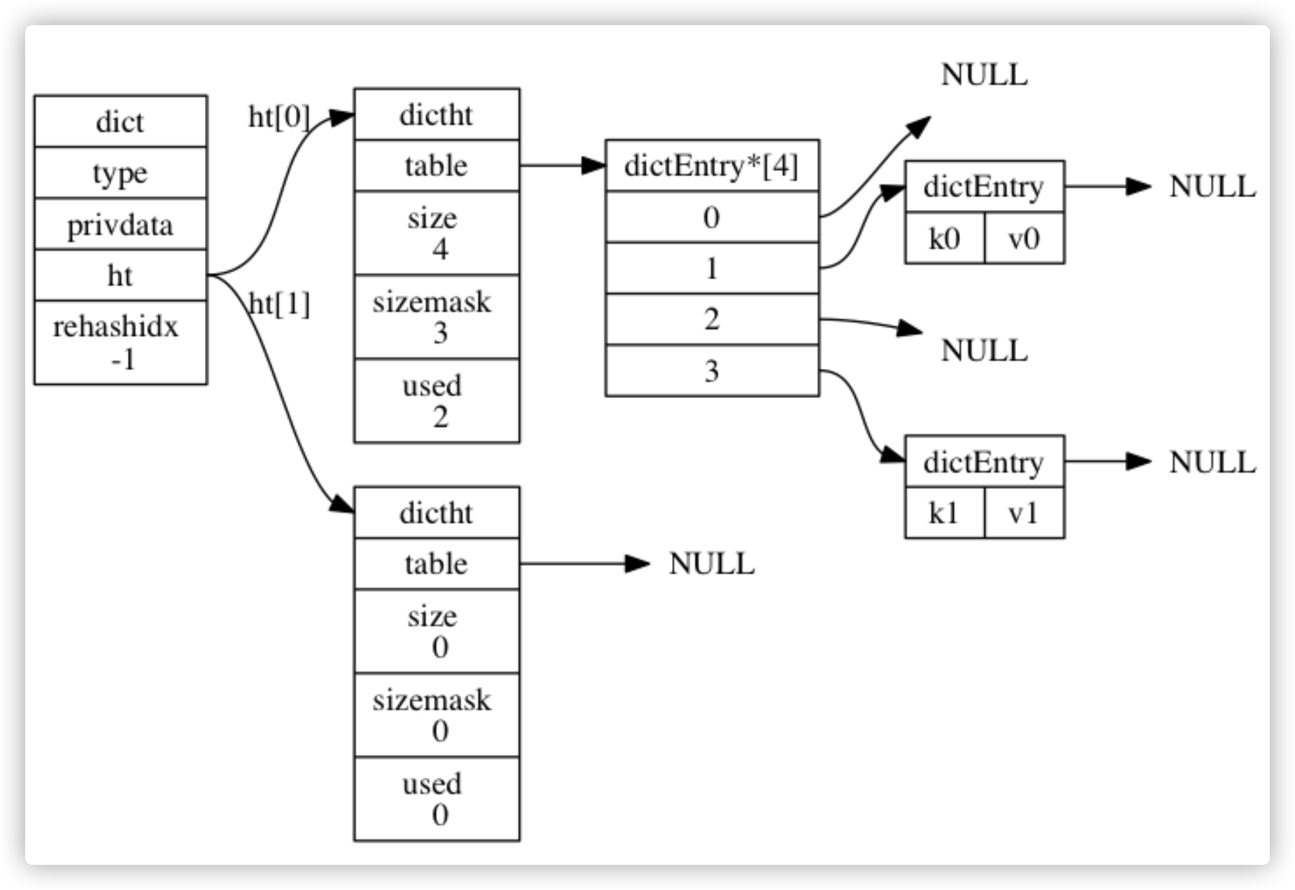 下图是一个完整的字典结构(普通状态下,没有进行 rehash):